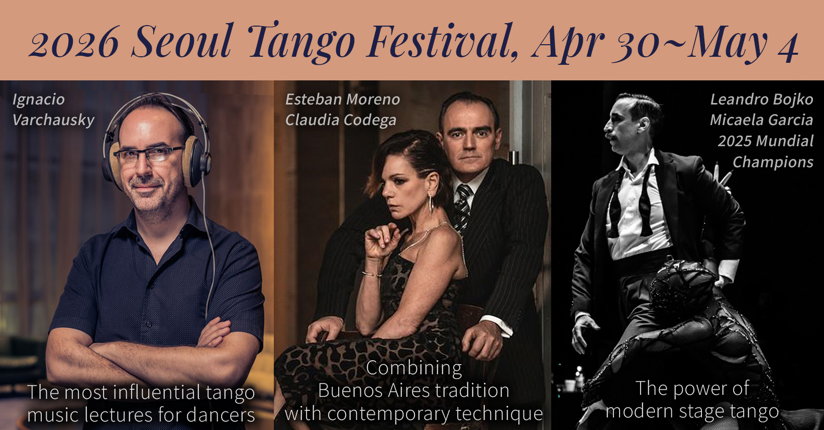 We are very excited to announce that this year’s Seoul Tango Festival will be April 30 to May 4, with 3 teams of outstanding maestros: