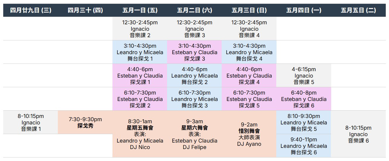 兩位老師同時帶來六堂精緻工作坊,從舞台探戈的基礎概念出發,逐步引導舞者,將熟悉的沙龍探戈動作轉化為具舞台表現力、完整且適合演出的舞段。課程重點放在舞台投射感、動作清晰度與動態表現,並以安全、有系統的方式教授共享軸線與空中動作,始終保留音樂性與阿根廷探戈的核心精神。